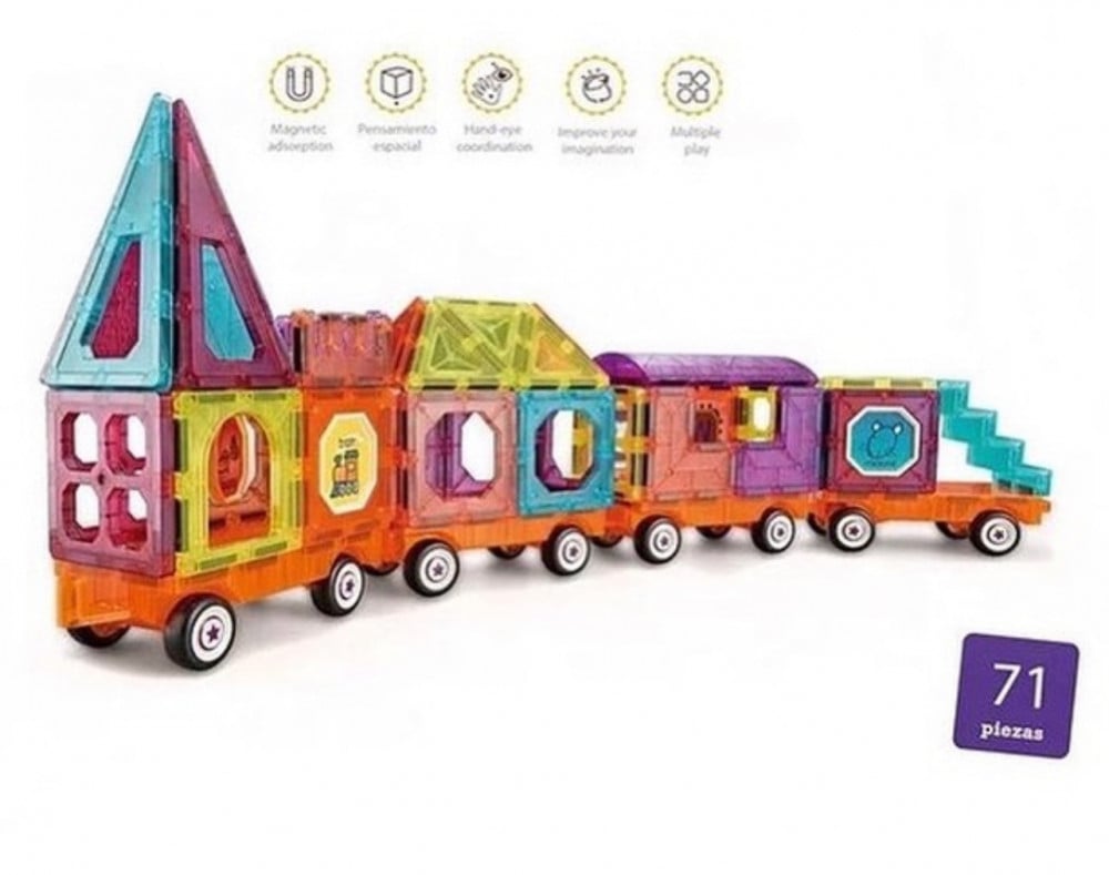 تضم اللعبة 71 قطعة متنوعة من قطع المغناطيس الملونة مختلفة الأشكال والأحجام.